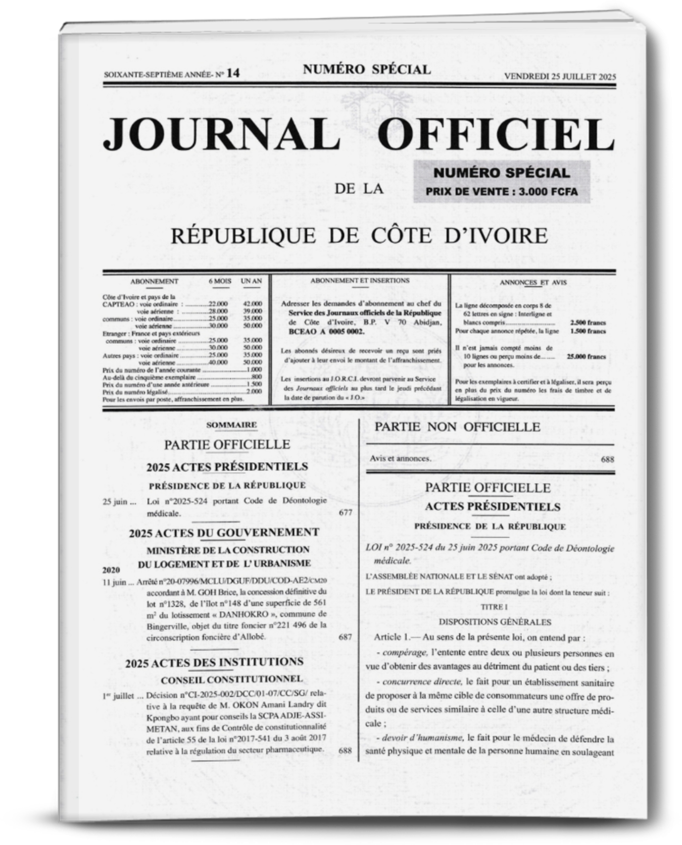 1er juillet … Décision n°CI-2025-002/DCC/Ql-07/CC/SG/ relative à la requête de M. OKON Amani Landry dit Kpongbo ayant pour conseils la SCPA ADJE-ASSI- METAN, aux fins de Contrôle de constitutionnalité de l’article 55 de la loi n°2017-541 du 3 août 2017 relative à la régulation du secteur pharmaceutique.