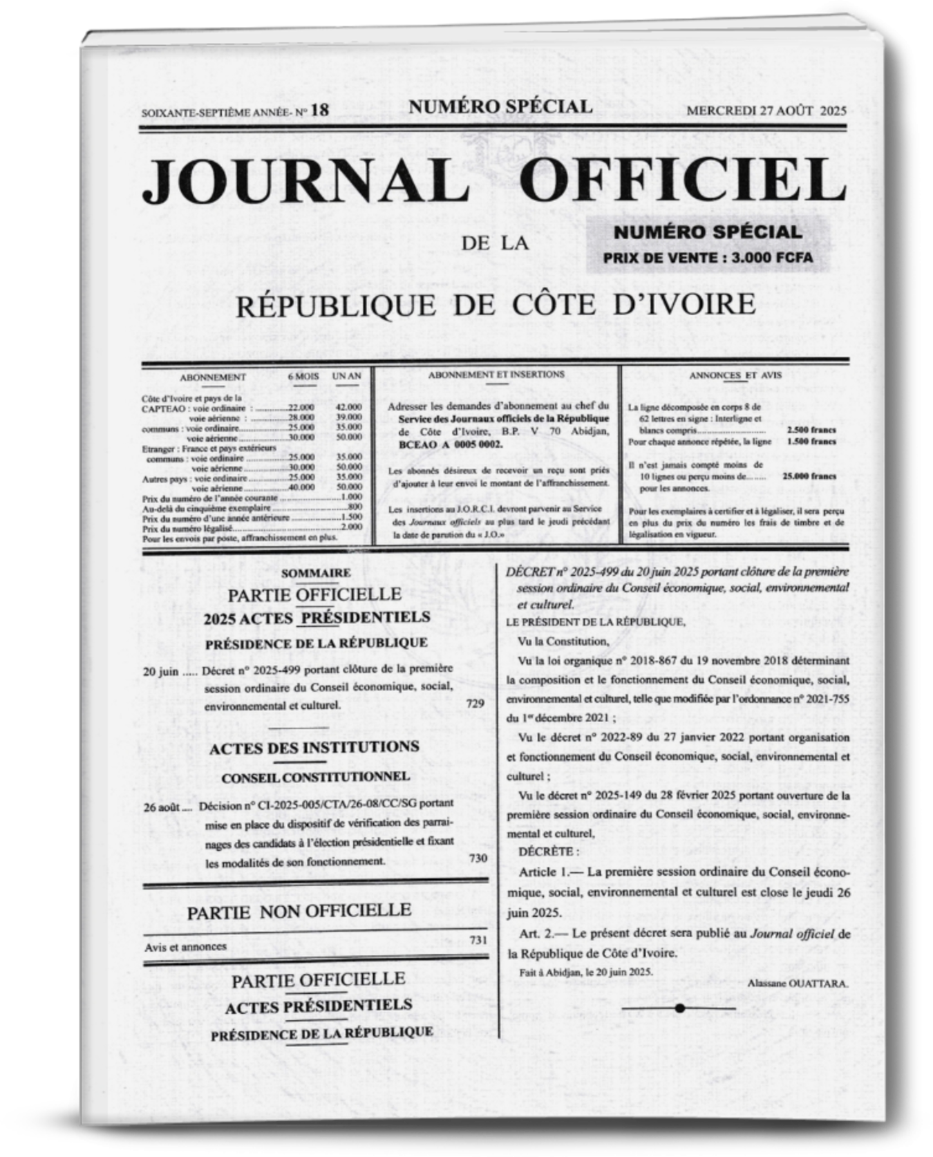 Journal Officiel N°18 Spécial du Mercredi 27 Aout 2025 ( Cote d’Ivoire)