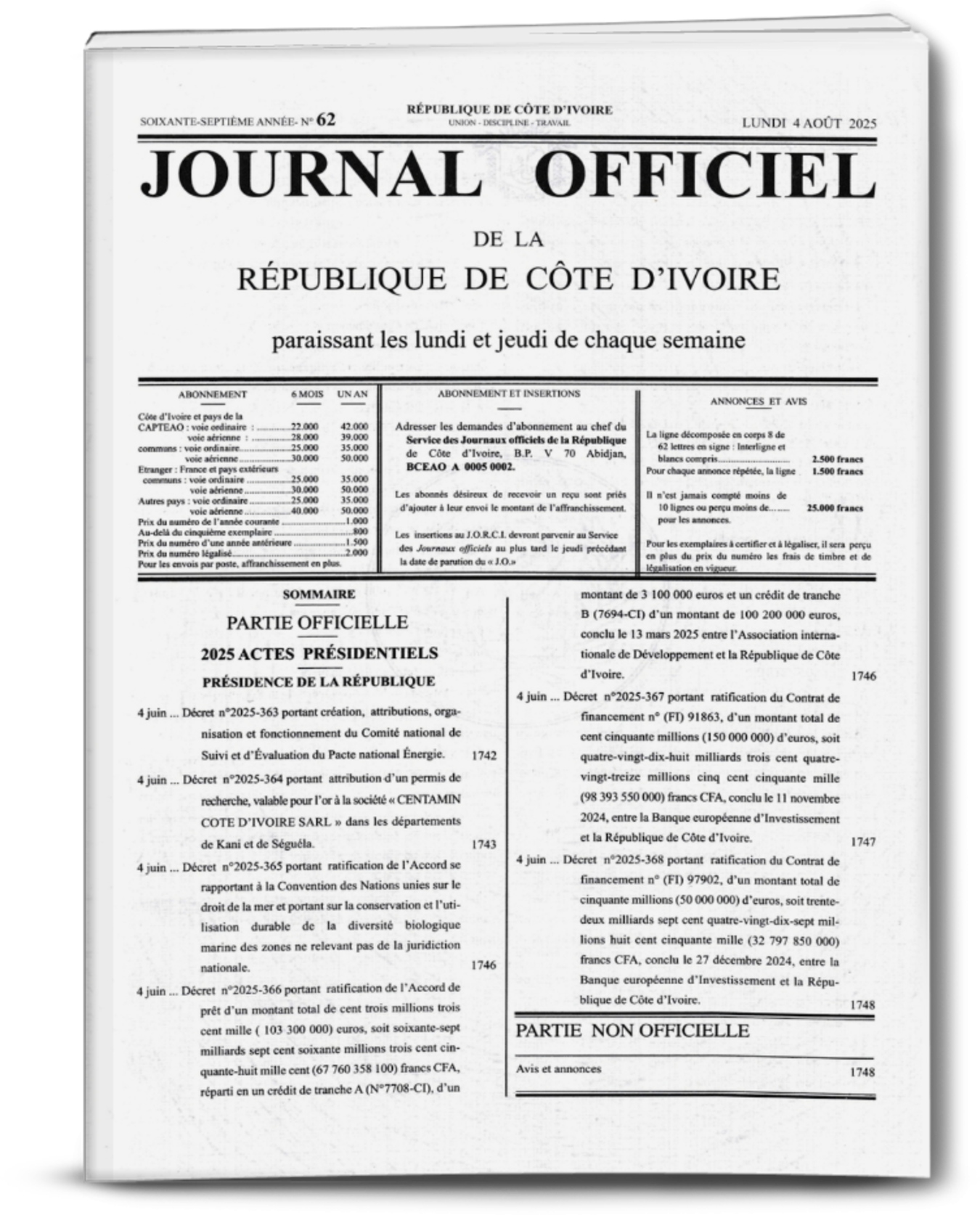 Journal Officiel N°62 du Lundi 04 Aout 2025 (Cote d’ivoire)