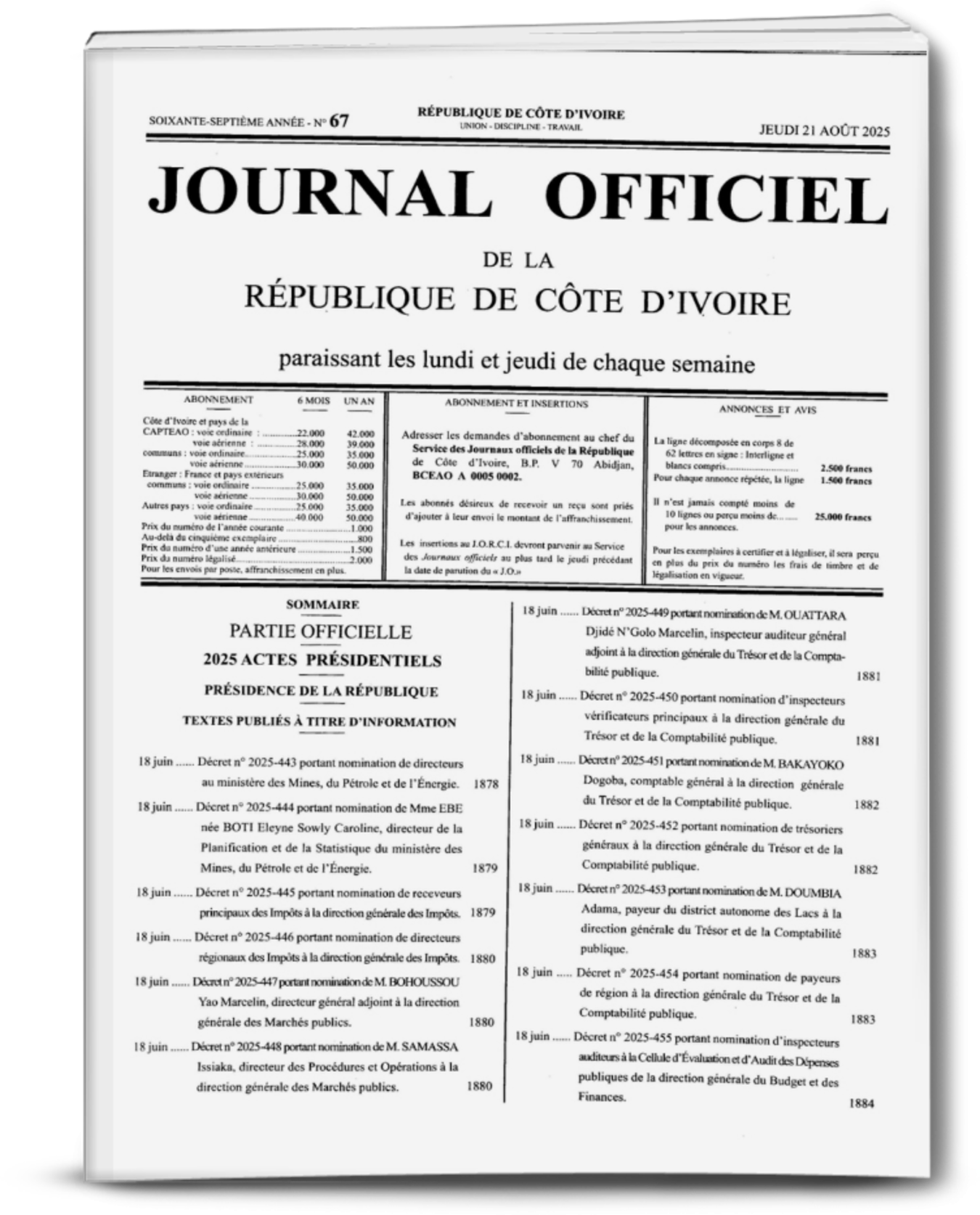 Journal Officiel N°67 du Jeudi 21 Aout 2025 (Cote d’ivoire)