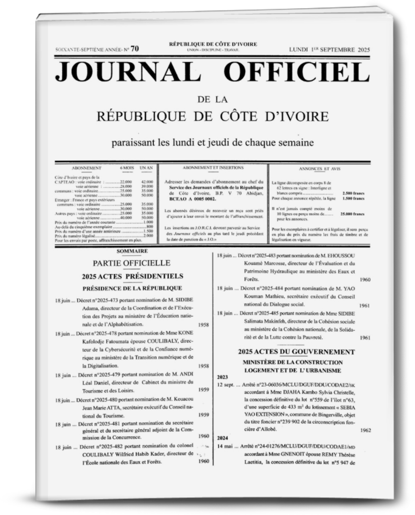 Journal Officiel N°70 du Lundi 01 Septembre 2025 (Cote d’ivoire)