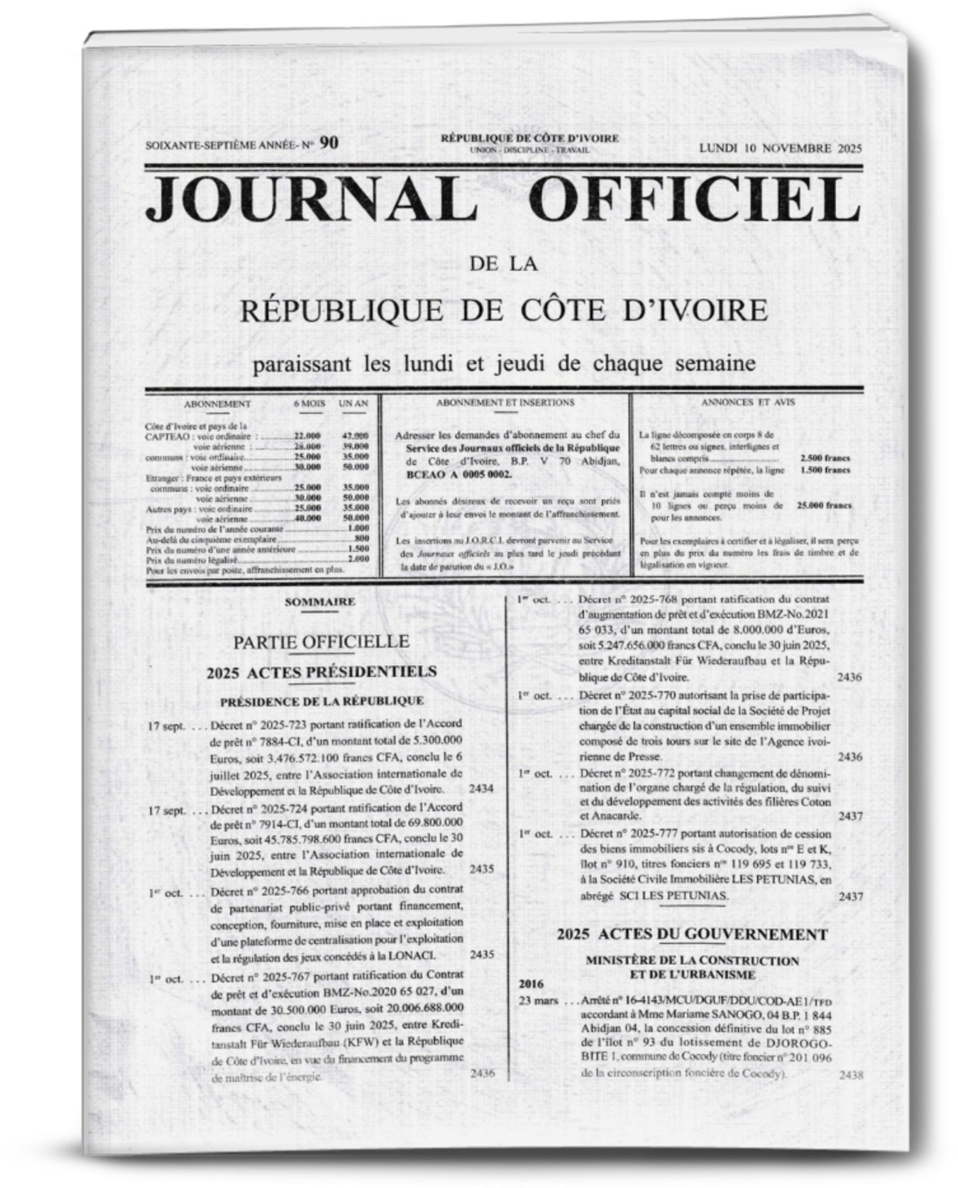 Journal Officiel N°90 du Lundi 10 Novembre 2025 (Cote d’ivoire)