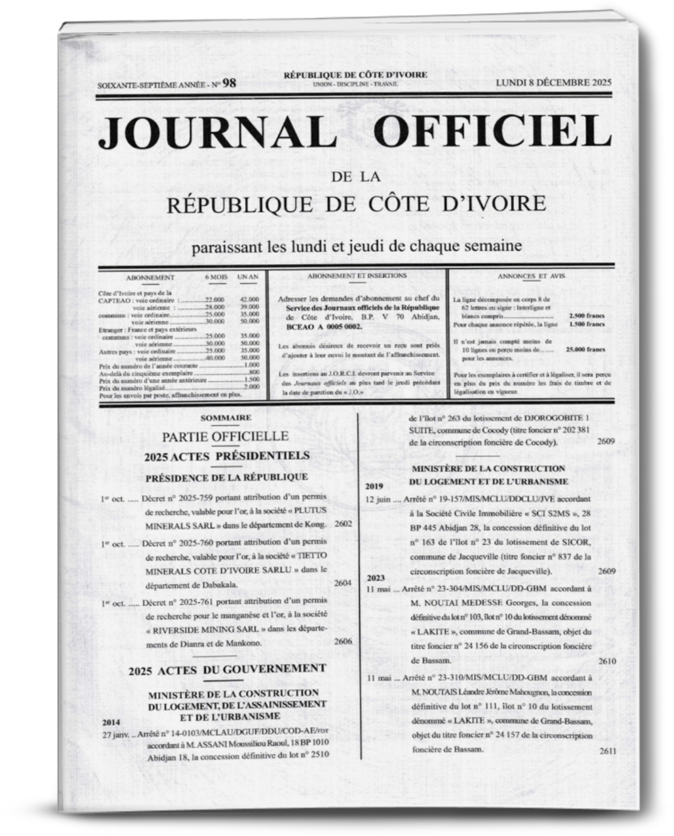 Journal Officiel N°98 du Lundi 08 Décembre 2025 (Cote d’ivoire)